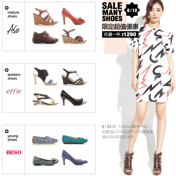 阿瘦皮鞋總共有三個品牌ASO/effie/BESO,分別為中老年/OL女性上班族/青年三種消費族群,所以在廣告設計上就會有所不同,ASO講求高功能性與經典款,effie訴求百搭適合通勤又時尚的鞋款,而BESO就是屬於可愛活潑年輕又用色大膽的款式。